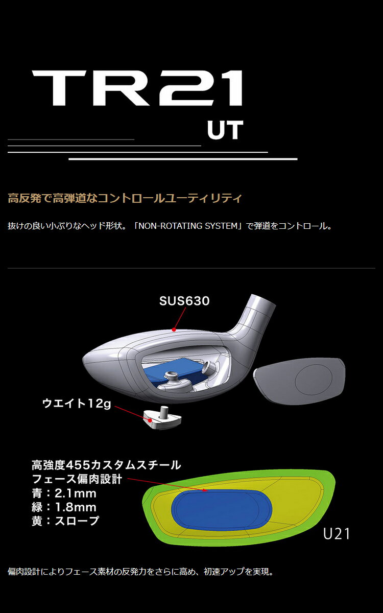 メーカー希望小売価格はメーカーカタログに基づいて掲載していますヘッド素材/製法 ボディ/SUS630/鋳造、フェース/高強度カスタムスチール/圧延 番手 U18 U21 U24 ロフト角(°) 18 21 24 ライ角(°) 57.5 58 58.5 長さ(インチ) 40.5 40 39.5 ヘッド体積(cm3) 110 108 106 バランス R D2 S D2 X ※ 総重量(g) R 351 355 359 S 354 358 362 X ※ ※総重量は設計値、その他は実測平均値になります ※印のスペックはオーダー対応 カウンターバランスと先調子化でスイングスピードがアップ。